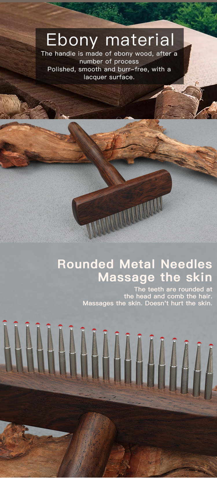 EBONY Wood Open Knot Comb Hair Double Row Design Sturdy Durable Pet Cat Nail Rake Brush for Dogs
